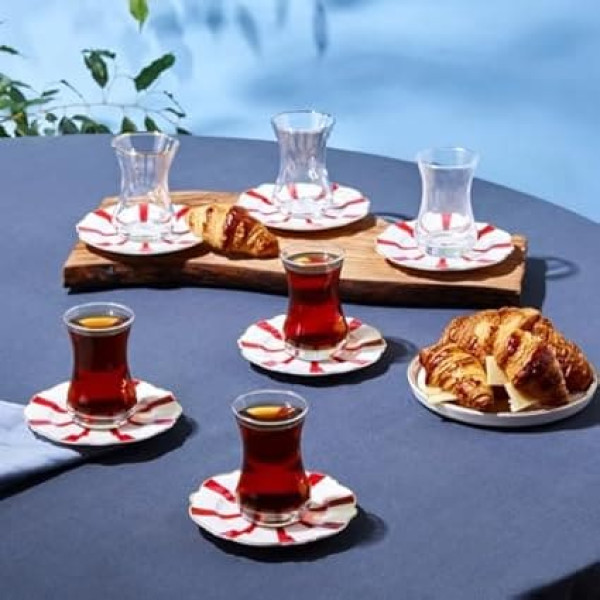 Karaca Astley 12 gabalu tējas tasīšu un šķīvīšu komplekts 6 personām, 110 ml, 6 turku tējas glāzes ar šķīvīšiem, 12 gabali, turku tēja, stikls, tējas plate, sarkans