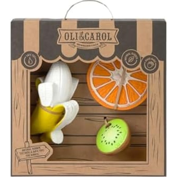 Oli & Carol Baby dāvanu komplekts 3 silikona zobu riņķīši (Ana Banana, Clementino Orange, Jose Antonio Kiwi), apelsīnu krāsā