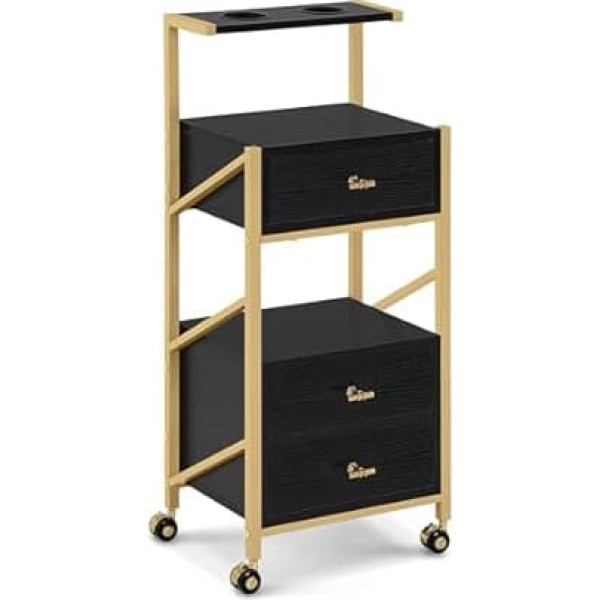 0048 Frizieru ratiņi ar riteņiem un 3 atvilktnēm, Servēšanas ratiņi, melni-zelta, salona ratiņi ar 2 plauktiem un 2 fēnu turētājiem, moderni darba ratiņi vannas istabai, viesistabai, 30 x 40