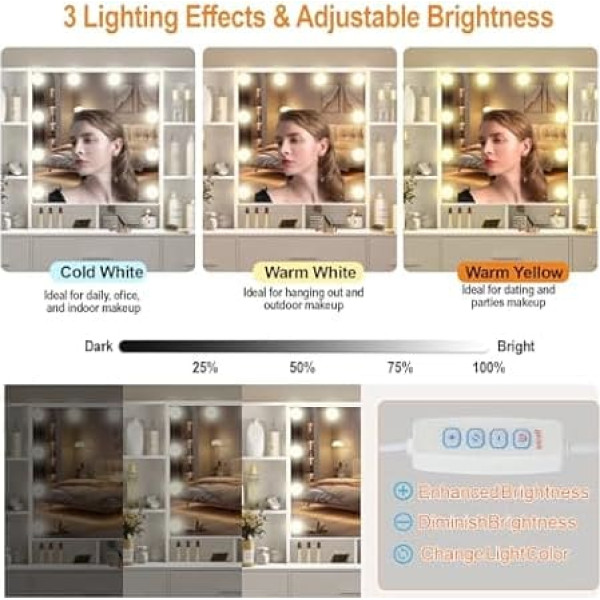 Ereousa Grima galdiņš ar spoguli un tabureti, grima galdiņš ar 6 atvilktnēm un 6 plauktiem, grima galdiņš ar regulējamu LED apgaismojumu, grima galdiņš guļamistabai, 80 x 36 x 131 cm, balts,