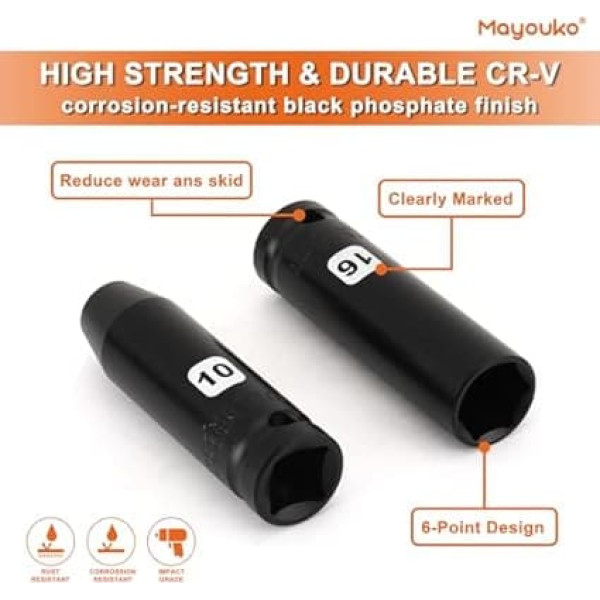 Mayouko 16 gabalu 1/2 collu uzmavu komplekts, no 10 mm līdz 32 mm, metriskais, ar 6 galiem, CR-V