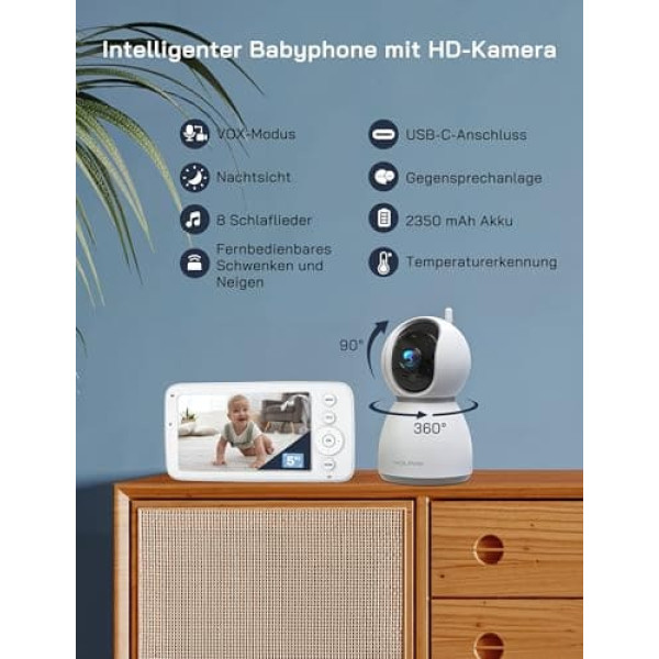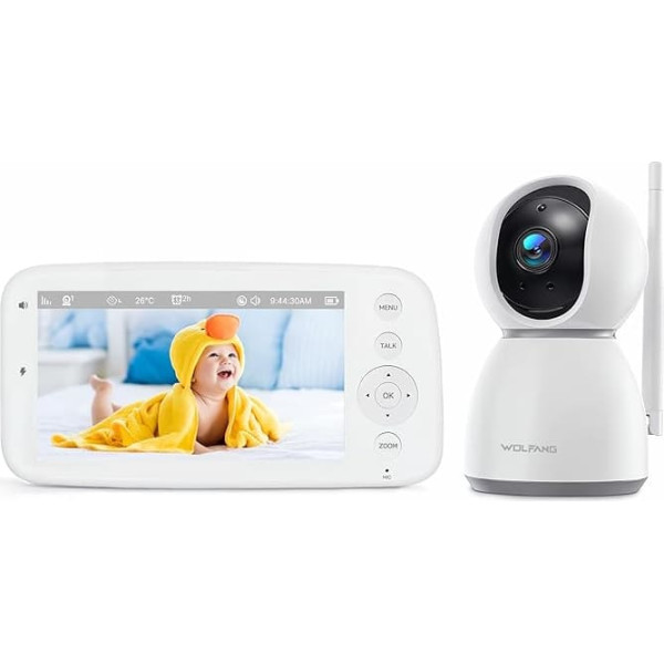 WOLFANG bērnu monitors ar kameru, 5 collu 720P displejs ar 20 stundu akumulatoru, panorāmas un tālummaiņas 1080P bērnu kamera ar nakts redzamību, bez WiFi, divvirzienu audio, temperatūra, šaušanas noteikšana, 1000 pēdu diapazons