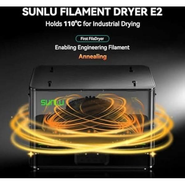 SUNLU oficiālais 3D printera filamentu žāvētājs E2, 110°C maksimālais 500W PTC sildītājs, žāvēšana un atkausēšana 2-in-1, dubultā kamera, dubultā kamera tehniskiem filamentiem, piemēram, PC PA-CF FR-ABS (melns)