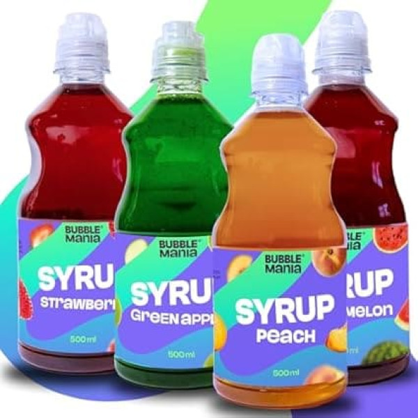 BubbleMania Fruit Zerup maisījums bez cukura 4 x 500 ml - zemeņu, zaļo ābolu, persiku, arbūza | Dzērienu sīrups popkornam, burbuļtējai, saldējumam un kūkai |