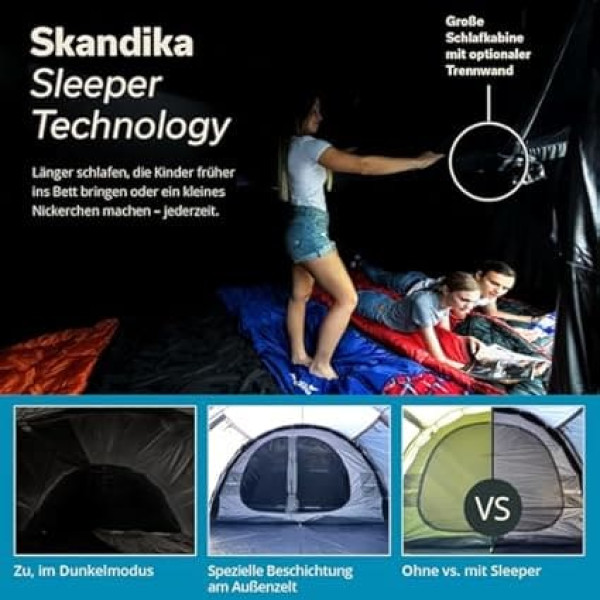 Skandika Gotland tuneļveida telts 5 personām, ģimenes telts ar iešūtu telts grīdu, ūdensnecaurlaidīga, 5000 mm ūdens kolonnas, 2 m augstums, melna guļamkabīne, moskītu tīkls, kempinga telts