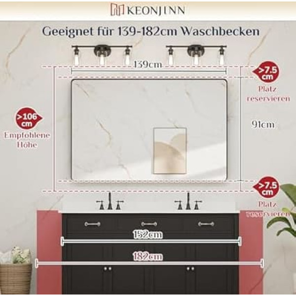 Keonjinn Vannas istabas spogulis, niķelis, 139 x 91 cm, sienas spogulis Vannas istabas spogulis ar metāla rāmi, rūdīts stikls, taisnstūra spogulis priekšnamam, vannas istabai, viesistabai, guļamistabai, sienas rotājums