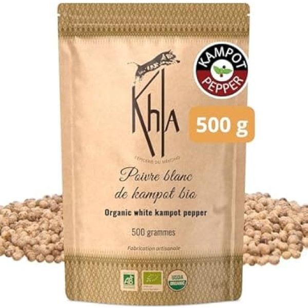 Khla - Kampot Pipari baltie organiskie 500g - baltie piparu graudiņi veseli organiski - Grand Cru, spēcīgi un spēcīgi - Ingredientu virtuve - tieši no ražotāja - baltie graudiņi veseli dzirnavām - no Kambodžas