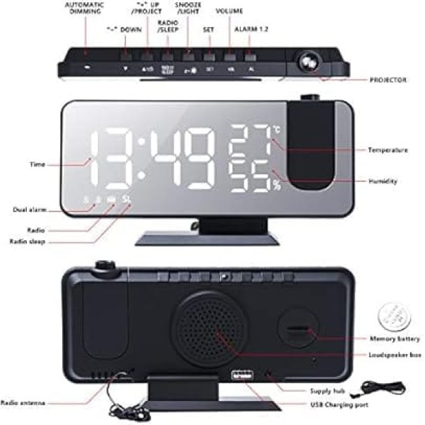 DollaTek radio projekcijas modinātājs LED liela ekrāna temperatūras un mitruma elektroniskais pulkstenis guļamistabas virtuves dāvanai — melns apvalks, balts, digitāls
