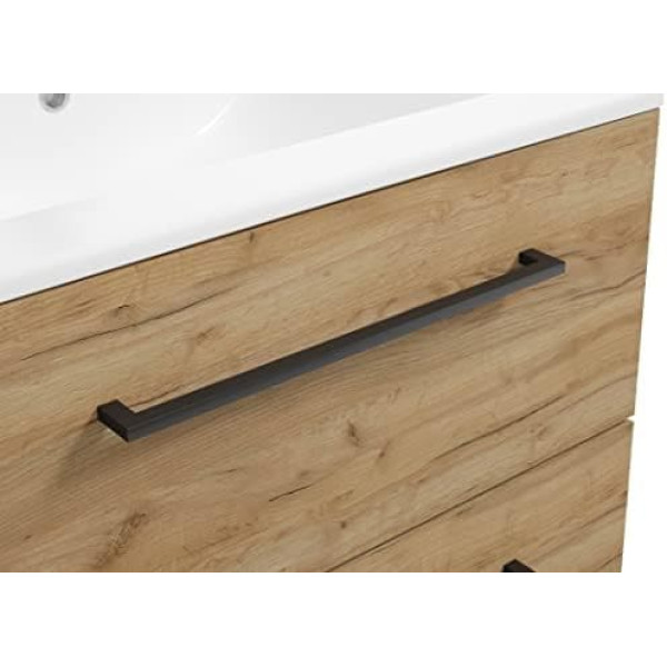 Pobicia Bilbao vannas istabas mēbeļu komplekts, tualetes skapītis ar keramikas izlietni, 2 atvilktnes, mīksta aizvēršana, futūristisks dizains, ozols ar melniem rokturiem, 60 x 46 x 52 cm